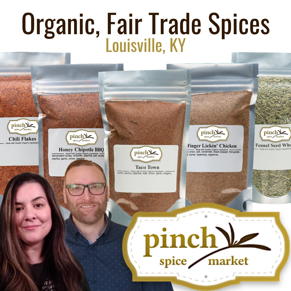 Pinch Spice Market is a couple-owned organic and fair trade spice company based in Louisville, KY. We specialized in sourcing the finest, freshest spices and herbs direct and fair-trade from farmers, and making them into delicious spice blends at our spice factory in the Portland neighborhood. When you buy spices fair trade with Pinch, you're supporting a local family-owned business, and you're helping lift spice farming families out of poverty in the U.S.A. and around the world.